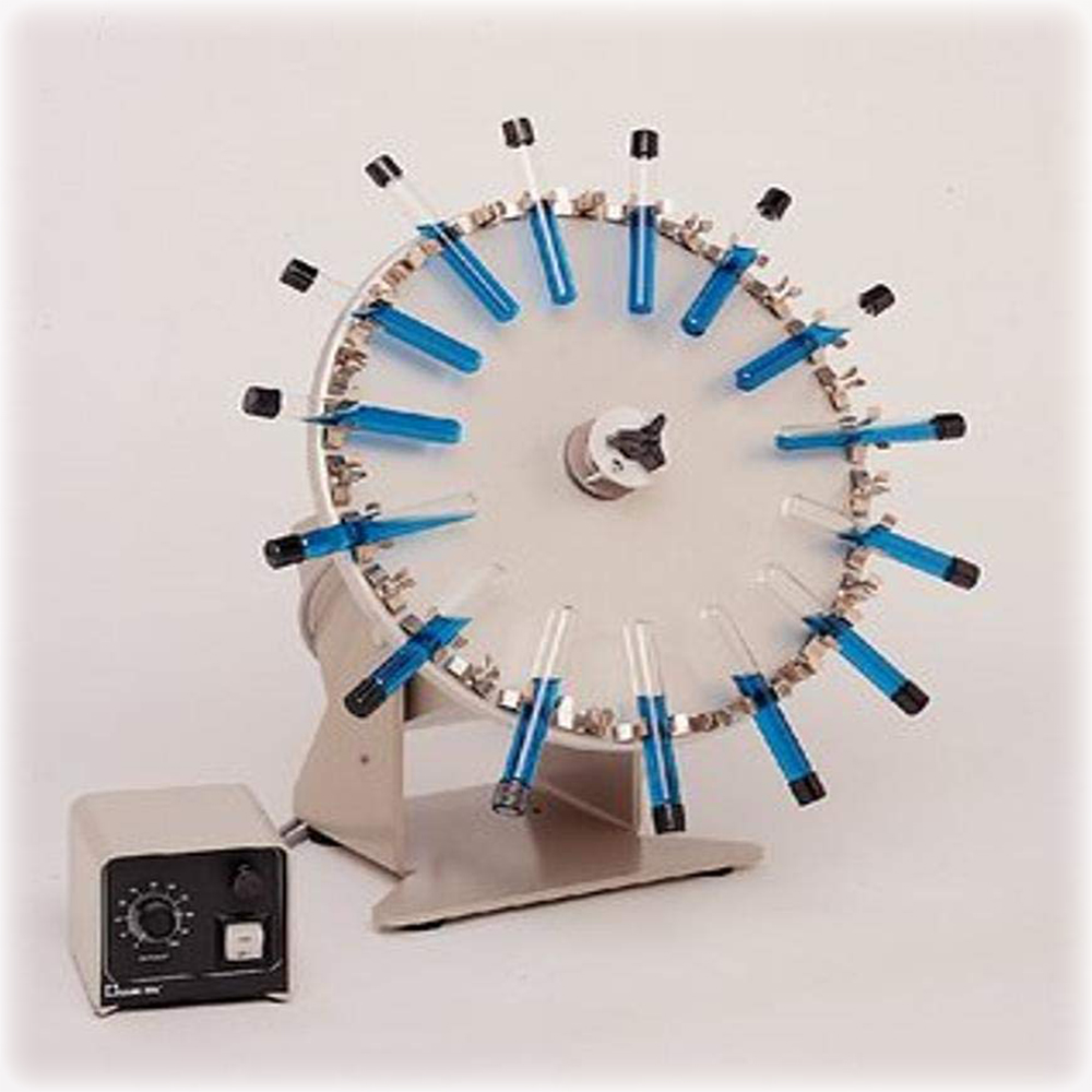 | Rugged RotatorVariable speed adjusts mixing action from a gentle slosh to rapid agitation. Driven by a continuous-duty motor, it can stand up to demanding schedules and long hours of operation. Some of the procedures it can be used for are embedding electron microscopy, tissue-culture specimens, blood cell suspensions, washing of precipitates, disintegrating tablets, extracting, dissolving slow-reacting samples, homogenizing blood solids with plasma, and rotating closed containers for dialysis bags. A unique clamping device utilizes leverage to assure selected motor position and permits positioning of the motor at any point within a 110° arc. Containers remain visible during rotating. Sturdy, stable, well-balanced, compact base handles substantial loads. Cord-attached speed control module allows convenient placement to avoid danger when starting or stopping rotation. Furnished complete with test tube head and 31 spring clips to accommodate 10mm to 18mm tubes and 16 spring clips to accommodate 20mm to 30mm tubes. | ||